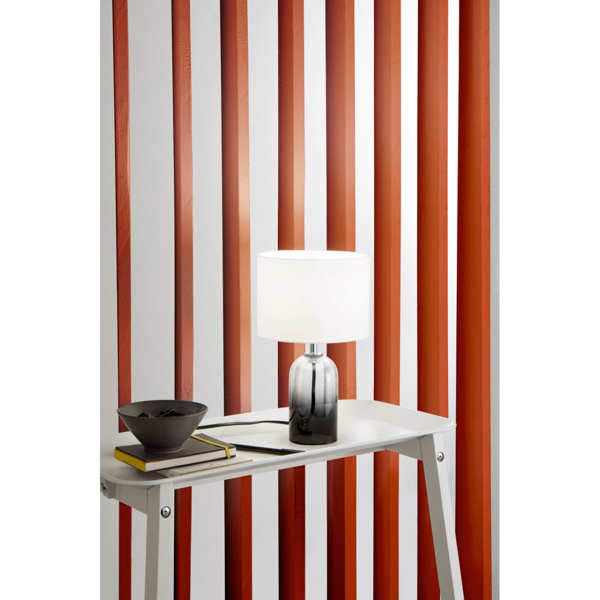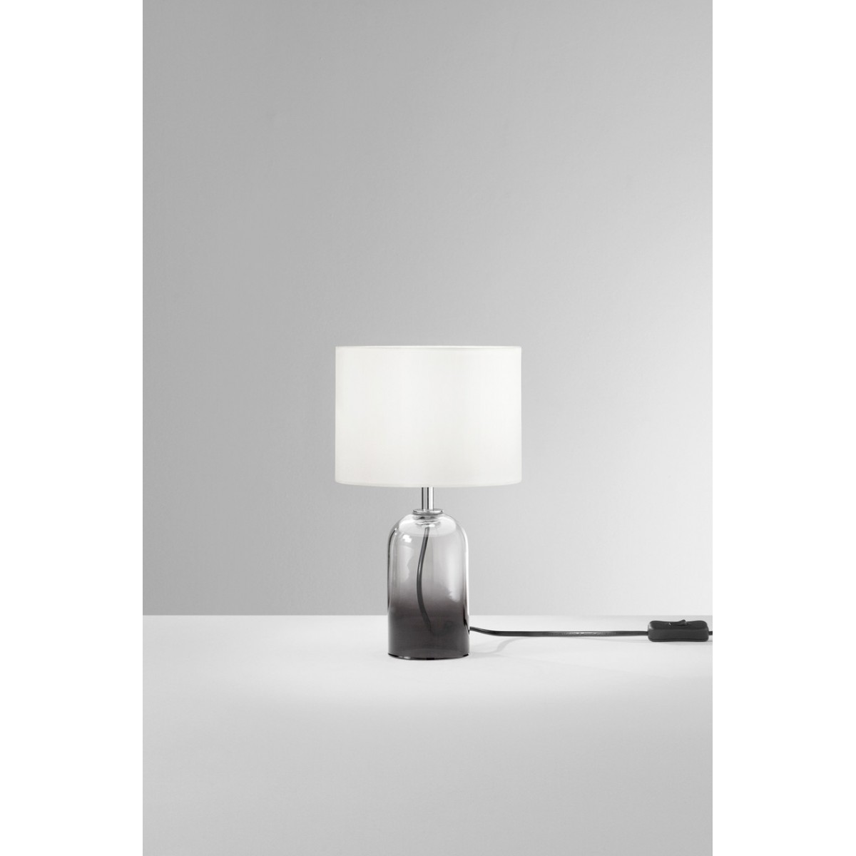 London Επιτραπέζιο Φωτιστικό I-LONDON-L-GR σε γκρι απόχρωση, με σκουρόχρωμη γκρι γυάλινη βάση και λεπτό υφασμάτινο καπέλο. Χαρίζει σοφιστικέ φωτισμό και ταιριάζει ιδανικά σε σύγχρονους, προσεγμένους χώρους.