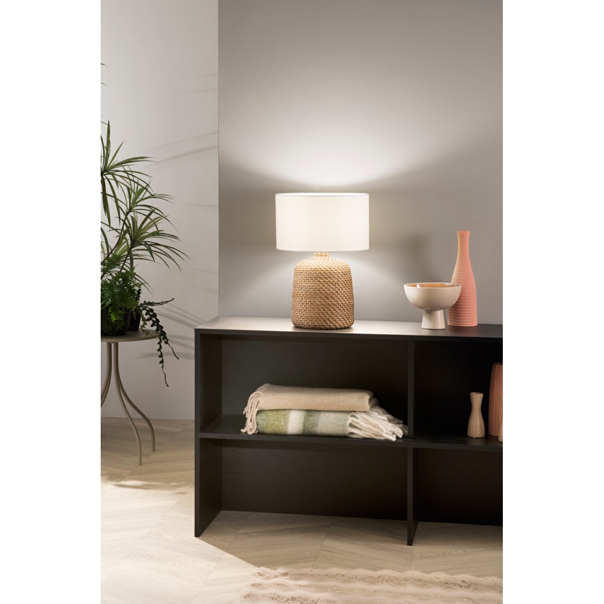 Malacca Επιτραπέζιο Φωτιστικό I-MALACCA-L με πλεκτή ξύλινη βάση που αποπνέει φυσική χειροποίητη αισθητική. Ο ζεστός φωτισμός του και το γήινο στυλ το καθιστούν ιδανικό για χώρους που συνδυάζουν απλότητα και διακόσμηση με χαρακτήρα.